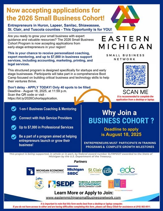 🚨 Deadline Extended. 🚨 Lapeer County small businesses—this one's for you. You now have until Monday, August 18 at 11:59 PM to apply for the Eastern Michigan Small Business Network (EM-SBN) 2026 Cohort Program — a game-changing opportunity for entrepreneurs and startups across Lapeer County.