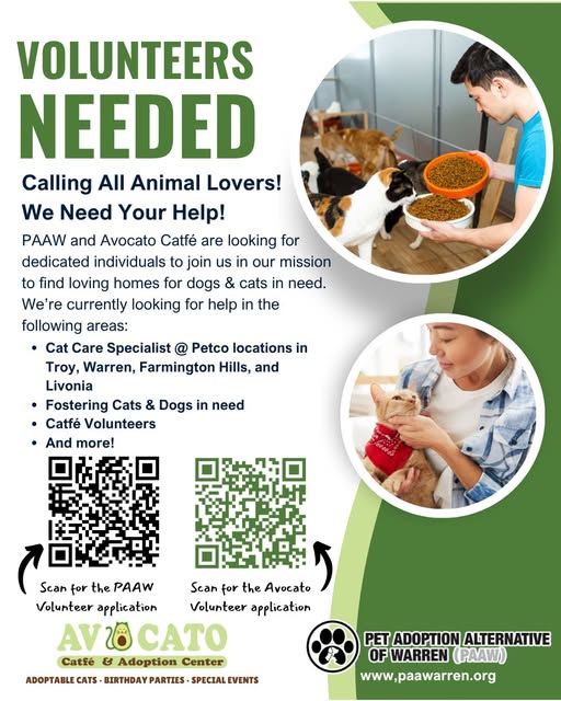 We need you to join our rescue crew. πͺ PAAW is looking for volunteers to help clean, care for, and socialize our adoptable kitties at our four Petco locations in Troy, Warren, Farmington Hills, and Livonia. π§Ήπ± Additionally, weβre always looking for fosters to give homeless cats and kittens a cozy place to crash while they wait for forever homes.