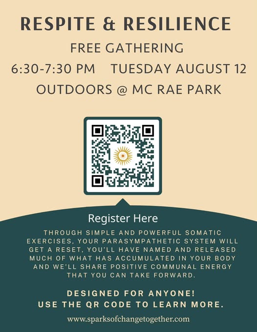 Neighborhood Happenings: Respite & Resilience Here’s a free community offering we’re excited to pass along. Respite & Resilience is happening Tuesday, August 12 from 6:30–7:30 PM at McRae Park. It’s an hour of simple, grounding somatic practices designed to reset your nervous system and build positive community energy.
