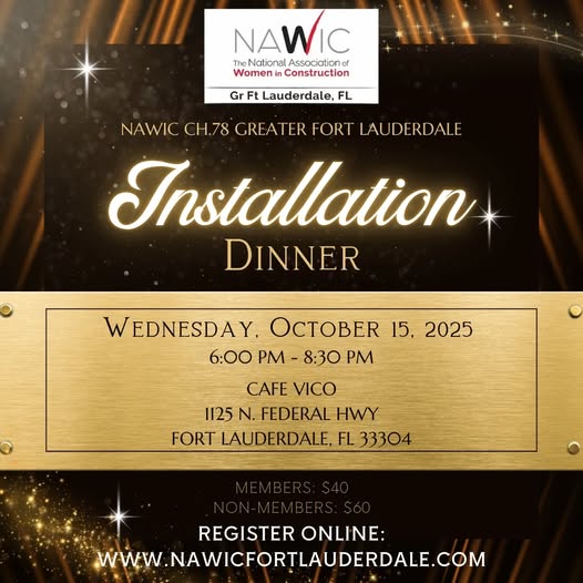 National Association of Women in Construction Ch. 78 Greater Ft. Lauderdale. Mtgs first Tues. of month @ Cafe Vico 1125 N. Fed. Hwy, Ft Lauderdale 11:45-1:30pm For more info or to join us, please email: nawic78@gmail.com