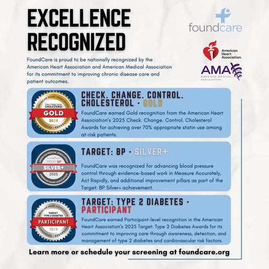 🏅 FoundCare is proud to be recognized by the American Heart Association and the American Medical Association with three national achievement awards for 2025, honoring our commitment to improving care in cholesterol, blood pressure, and type 2 diabetes management. 🥇 These awards reflect our dedication to evidence-based care, better outcomes, and the trust our patients place in us every day. We couldn’t do it without you.