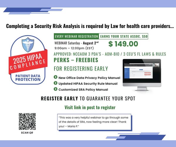 To Register or get FULL details visit:: https://patientdataprotection. com/security-risk-analysis-webinar/ Approved NCCAOM 3-PDA's AOM-BioMed Completing a Security Risk Analysis is required by law for health care providers who digitally create, store, and transmit patient data and other protected health information. The Analysis should be updated annually and a copy of this completed analysis document needs to be maintained for six (6) years.