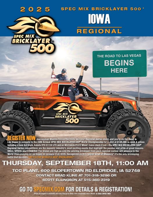 The Iowa Regional Spec Mix 500 is just around the corner and MII is excited for promote the Jr 500 and the apprentices from Bricklayers & Allied Craftworkers Local 3 Iowa and Illinois Local 8 that are competing. The Jr Bricklayer starts at 10am and the Bricklayer 500 starts at 11am. Good luck to everyone competing.