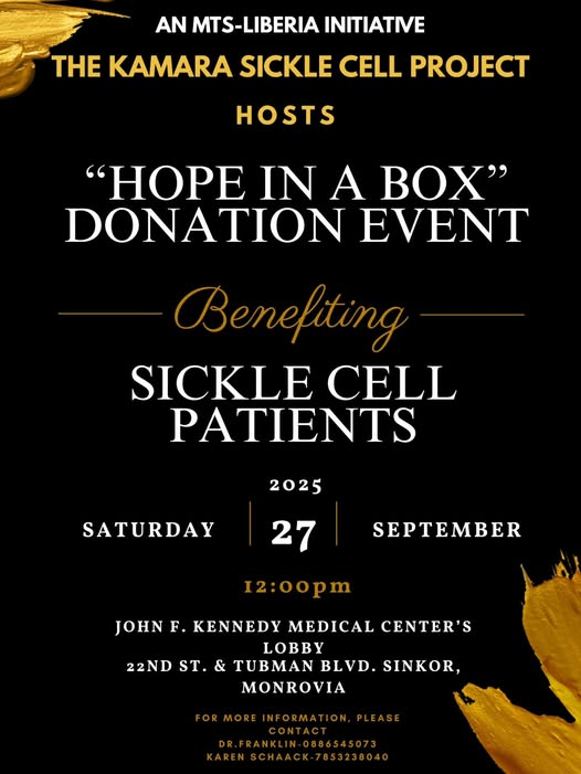 September 17, 2025-MONROVIA, LIBERIA The Kamara Sickle Cell Project(KaSp), an initiative of MTS Sickle Cell Foundation-Liberia (MTS-Liberia), IS SET TO host its FIRST DONATION EVENT FOR SICKLE CELL PATIENTS IN LIBERIA, “Hope in a Box,” on Saturday, September 27, 2025. Under the theme “Hope Delivered, Strength Renewed,” this landmark event seeks to uplift individuals affected by Sickle Cell Disease (SCD) in Liberia, and to show them THAT THEY ARE NOT ALONE. Each “Hope in a Box” package includes essential items tailored to the unique needs of sickle cell patients.