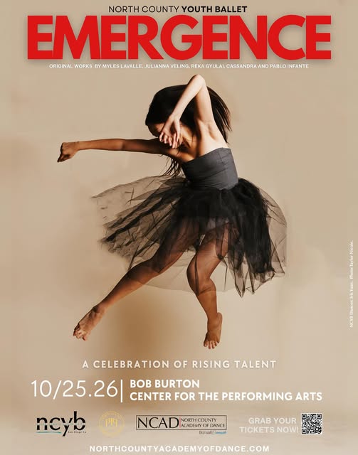 Join us as we proudly present Emergence, the debut performance of the North County Youth Ballet. This powerful new work celebrates growth, creativity, and the raw energy of youth through contemporary ballet. With original choreography and a passionate cast of young dancers, Emergence invites you to witness the beauty of becoming β told through motion, music, and spirit.