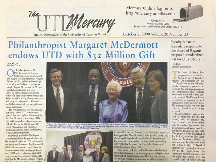 On September 26, 2000, Margaret McDermott made a transformative gift to The University of Texas at Dallas, founding the Eugene McDermott Scholars Program. Today, we honor her remarkable generosity and foresight, and we celebrate the many lives and communities that have been profoundly impacted by her actions.