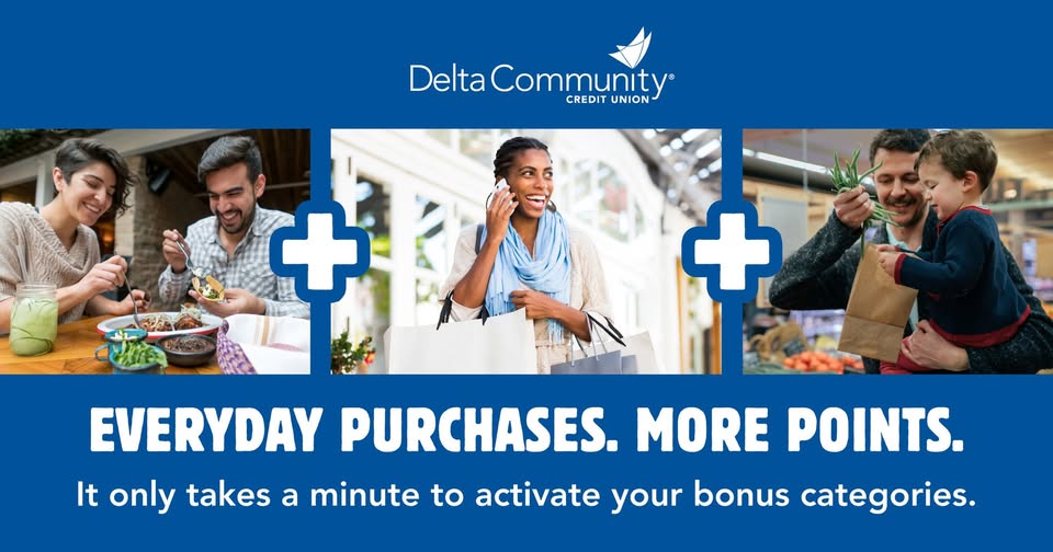 Each quarter, we offer an opportunity for members with our Visa® Platinum Rewards Credit Card to earn 2x or 3x Reward Points for purchases in select categories. If you’re a Platinum Rewards Credit Card holder, log in to Online Banking to activate your 2025 Q4 Bonus Reward Points offer. Learn more: DeltaCommunityCU.