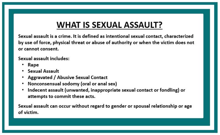 What is Sexual Assault. (Definition as of 2022) Sexual assault is any non-consensual sexual act — from unwanted touching to rape — committed by force, threats, manipulation, or when a person is unable to consent. This includes acts against people who are unconscious, intoxicated, underage, or otherwise unable to give clear and informed permission.