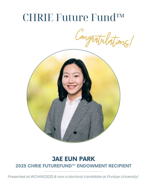 🎉 #FutureFundFriday Spotlight. 🎓 Meet Jae Eun Park, a doctoral candidate at Purdue University and winner of Track A: Best Dissertation Proposal at this year’s ICHRIE Global Conference in Indianapolis. 🏆✨ Her research — “Customer Journey in the AI Era: Touchpoints with Digital Platforms Across the Pre-, During-, and Post-Travel Stages” — explores how technology continues to shape the future of hospitality and tourism 🤖✈️.