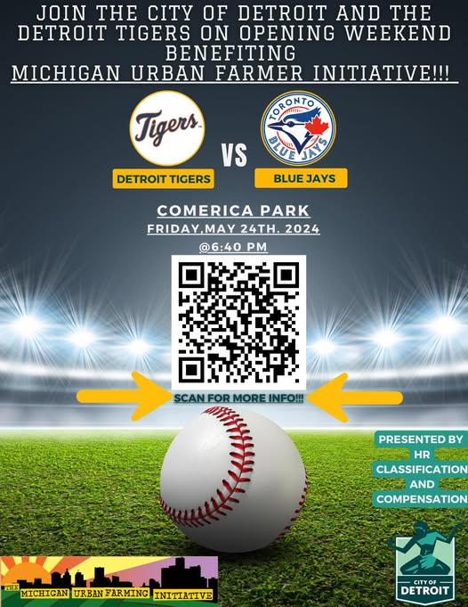 Join the City of Detroit and the Detroit Tigers at Comerica Park on Friday, May 24 for the City of Detroit Game of the Month benefiting the Michigan Urban Farming Initiative. The Detroit Tigers and the City of Detroit have partnered together for the 2024 season to provide discounted opportunities to see Detroit Tigers baseball and support local organizations that are making a difference in the community. To purchase tickets for this game please click here: https://fevo-enterprise.