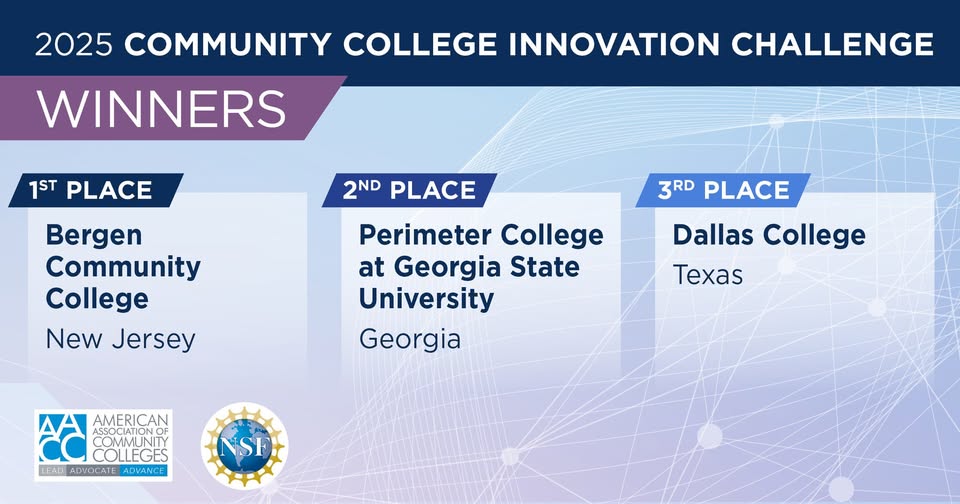 We are so proud of the three winners of the American Association of Community College's 2025 Community College Innovation Challenge. 📷Bergen Community College, NJ 📷Perimeter College at Georgia State University, GA @GSU_Perimeter 📷Dallas College, TX Dallas College We are especially proud of the Phi Theta Kappa members who were selected as winners and finalists.