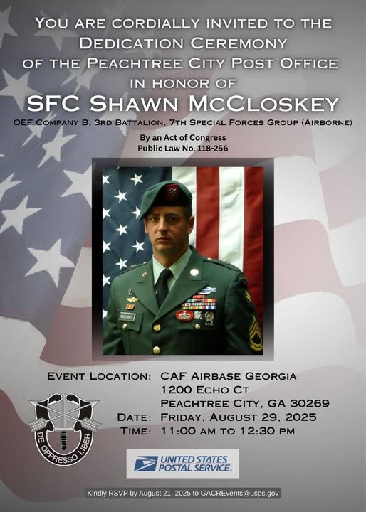 Sergeant First Class Shawn P. McCloskey of Peachtree City, gave his life for his country on Sept. 16, 2009 in Afghanistan when Shawn's vehicle was struck by an improvised explosive device while conducting a mounted patrol in the Afghan city of Ghur Ghuri, in support of combat operations while serving with, Company B, 3rd Battalion, 7th Special Forces Group (Airborne).