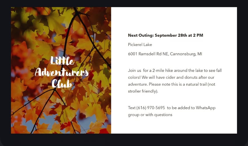 ๐ Little Adventurers Club โ Next Outing. ๐ ๐ Saturday, September 28th at 2 PM ๐ Pickerel Lake (6001 Ramsdell Rd NE, Cannonsburg, MI) Join us for a 2-mile hike around the lake to take in the fall colors. After our adventure, weโll enjoy cider and donuts together.