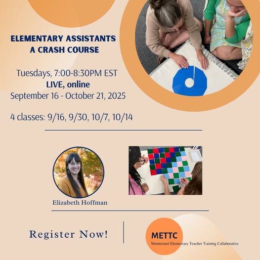 Learn about the dynamic relationship between the prepared adult, the prepared environment, and the elementary child. Our Elementary Assistants Crash Course is designed to support new to Montessori, or new to Elementary, staff members working with Elementary-aged children (6-12 years old). This workshop is appropriate for classroom assistants, as well as specialist teachers and before and aftercare staff.