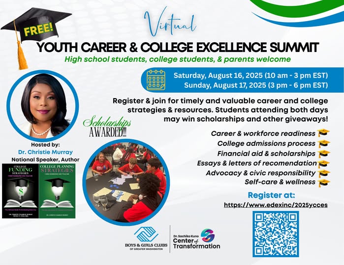 Boys & Girls Clubs of Greater Washington (BGCGW), Center of Transformation (CoT) invites you to attend the 5th annual Youth Career and College Excellence Summit (YCCES), a free, two-day virtual event happening August 16–17, 2025. This event is for high school students, current college students, and parents. YCCES will focus on offer “future-ready” tools and strategies before the upcoming school year begins to prepare for life after high school.