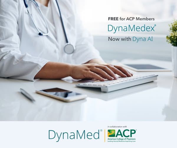 A free benefit of ACP membership, DynaMedex® provides comprehensive clinical and drug information on internal medicine topics at the point of care. Now with Dyna AI, you get evidence-based answers to your natural language questions in seconds. Stay informed with trusted, expert-reviewed content.