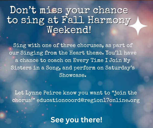 Everyone gets to sing at our upcoming Region 17 Fall Harmony Weekend, Singing from the Heart. Just sign up for one of three weekend choruses. You'll have a chance to work with a director and get coached on Every Time I Join My Sisters in a Song, and then you'll get to sing for the region in the Saturday night showcase.