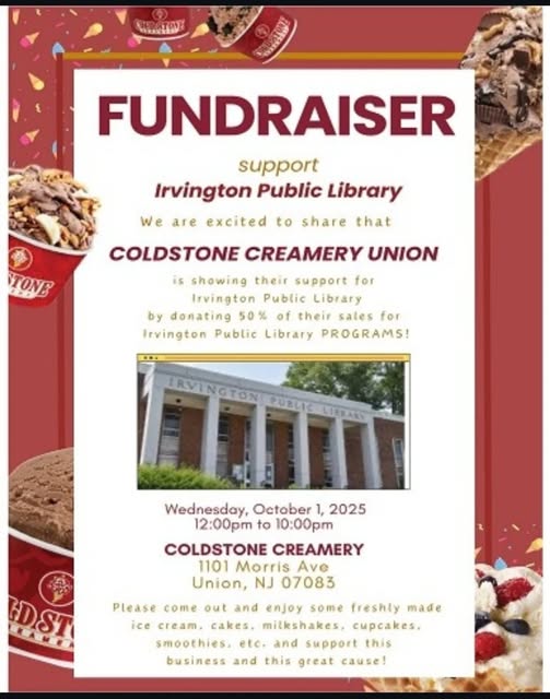 Come support our biggest supporter from day one. The Irvington Public Library offers numerous activities for all ages, holds a wealth of information, and always assists the community, all free of charge. Let's make sure they can continue providing services by enjoying a delicious scoop.