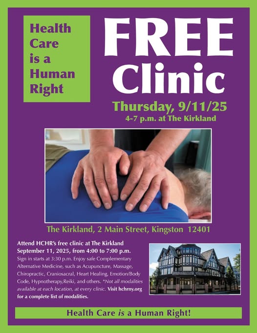 Health Care is a Human Right provides FREE, Quality, Compassionate Holistic Healthcare. All welcome! Make holistic wellness education and care available to everyone in our local communities. HCHR works with dedicated professionals who volunteer their services and expertise in a range of holistic wellness modalities and coordinates free quarterly holistic wellness clinics in Woodstock and Phoenicia and monthly in Kingston.