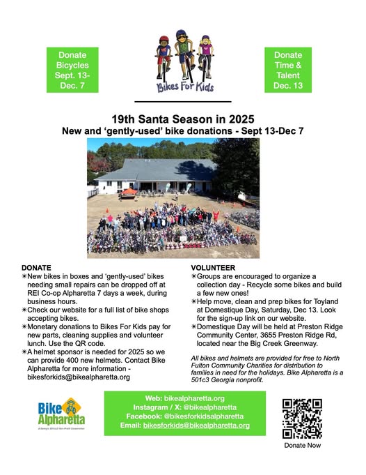 501c3 non-profit advocating enjoyable and safe cycling for people of all ages. We manage Bikes For Kids to refurbish bikes/trikes in Dec. for families in need. Bike Alpharetta is a community advocacy organization in Alpharetta, Ga.