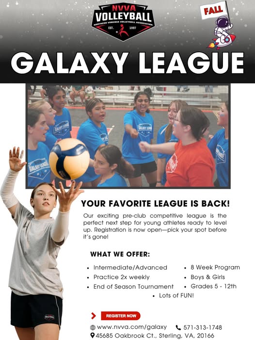 Northern Virginia Volleyballl Association Youth Academy Galaxy League NVVA Camps Club Volleyball Adult Volleyball Beach Volleyball Tournaments Galaxy League Galaxy League NVVA Welcome to your volleyball journey GALAXY LEAGUE 8week program twice a week for beginner and intermediate boys and girls grades 3 12 YOUTH ACADEMY Onceaweek program on Sun Mon Wed for beginners boys and girls ages 5 16 XPERFORMANCE Club Volleyball Program for intermediate and advanced athletes ages 12 to 18 LOUDOUN YOUTH VOLLEYBALL Compete in the largest youth volleyball league in Northern Virginia. For girls and boys ages 1117. NVVA PLUS Weekly skill classes for beginner intermediate and advanced boys and girls grades 6 12 VOLLEYBALL CAMPS Weeklong volleyball training for beginner intermediate and advanced boys and girls grades 3 12 BEACH VOLLEYBALL LESSONS INDOOR VOLLEYBALL LESSONS ADULT LEAGUE Super Nova League and Adult Open Gym ADULT BEACH LEAGUES Play in our indoor volleyball court NORTHERN VIRGINIA CLUB LEAGUE Join our mailing list. Thanks for subscribing.