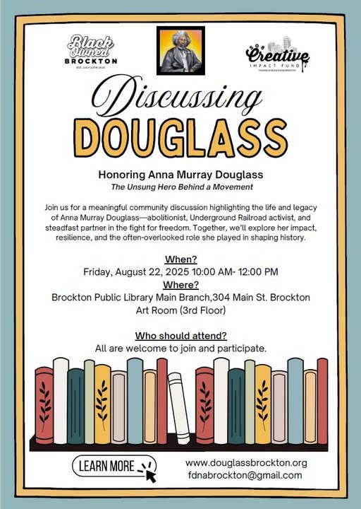 Join us for "Discussing Douglass" this Friday, August 22 at 10 AM at the Brockton Public Library (304 Main St. , Brockton - third floor) This free event will spotlight Anna Murray Douglass—Frederick Douglass’s first wife and an unsung hero of the abolitionist movement. Hear her story brought to life by Jill Wiley’s powerful oration, and discover how Anna helped Frederick escape slavery and supported their family.