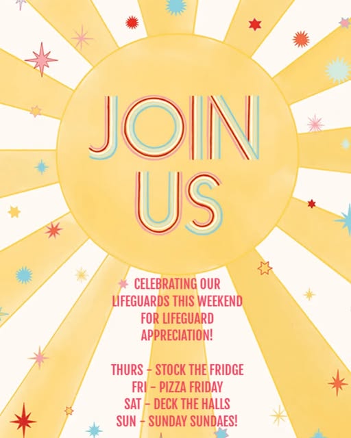 We need your help to make this happen. On the sign up linked below you will find the lifeguards’ favorite snacks and drinks to stock the fridge as well as items for the Sundae Bar and Pizza Friday. If you’d like to donate to make this a success, any little bit will help.