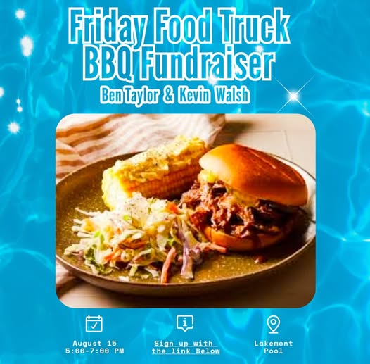 Ben Taylor (Life guard and swim coach at Lakemont pool) and Kevin Walsh are fundraising for their Senior Trip next year. They will be selling BBQ plates for $12 with pulled pork, coleslaw, and baked beans at the pool on August 15th from 5pm to 7pm. We are taking preorders up to Tuesday, August 12th by 10pm.