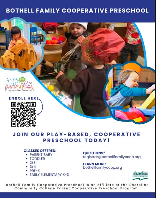 Looking for a nurturing, play-based start to your child’s learning journey. Bothell Family Cooperative Preschool is enrolling—especially for our Parent Baby and Early Elementary (K–3) classes. Join a community where parents grow alongside their little ones, supported by experienced educators and joyful hands-on learning.
