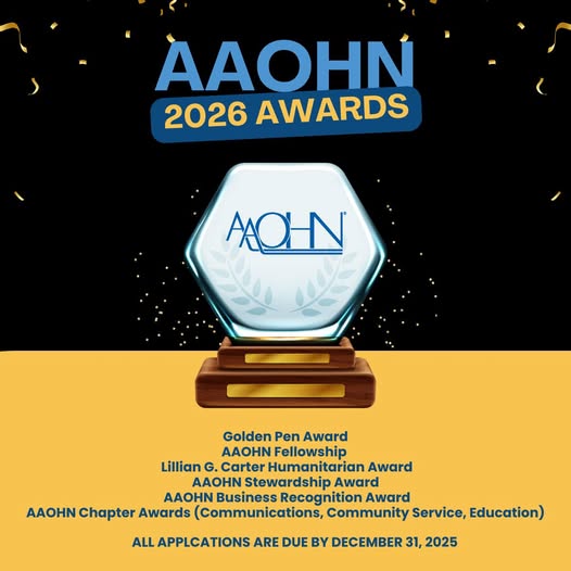 Recognize outstanding contributions in occupational health nursing by submitting nominations or applications for the 2026 AAOHN Awards. The deadline is December 31, 2025. Available Awards ποΈ Golden Pen Award π AAOHN Fellowship π Lillian G.