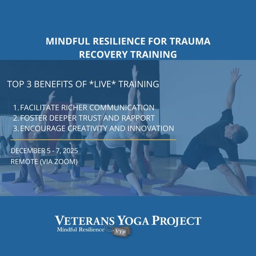 Enjoy the benefit of *live* online training by engaging with other teachers for connection and community. đź’› MINDFUL RESILIENCE FOR TRAUMA RECOVERY *LIVE* đź’› Training for Yoga Teachers and Healthcare Professionals (Online) December 5-7, 2025 Learn more and apply at Veterans Yoga Project: https://veteransyogaproject. org/mrt/ Taught by Veterans, for Veterans and others called to help.
