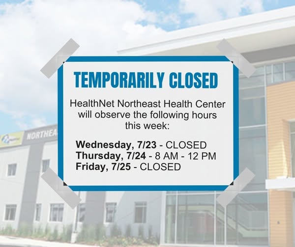 HealthNet Northeast Health Center will observe the following hours this week: Wednesday, July 23 - CLOSED Thursday, July 24 - 8 AM - 12 PM Friday, July 25 - CLOSED We apologize for the inconvenience. To make an appointment at a different HealthNet location, please call 317-957-2070.