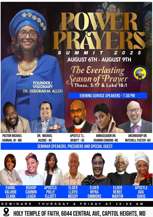 The Power Prayers International Network presents the Power Prayers Summit 2025, happening from Wednesday, August 6, 2025, to Saturday, August 9, 2025, at the Holy Temple of Faith, located at 6604 Central Ave, Capitol Heights, MD. Join us for four days of life-changing worship experiences, attended by a diverse group of Christian leaders from across the nation.