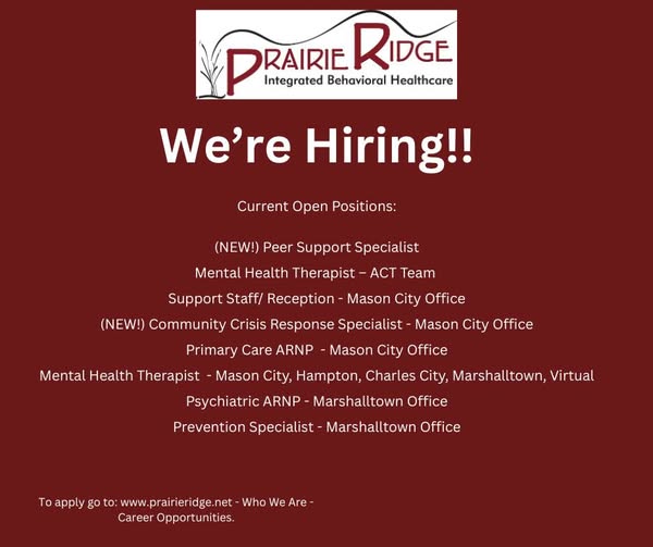 Prairie Ridge offers quality and effective substance misuse treatment, mental health and prevention services using evidence-based programs and processes. THE PRAIRIE RIDGE MISSION IS TO REDUCE THE IMPACT OF DRUG AND ALCOHOL ABUSE UPON THE AFFECTED INDIVIDUALS, FAMILIES AND COMMUNITIES OF NORTH IOWA. OVER THE YEARS, THE AGENCY HAS EXPANDED ITS SERVICES AND INCLUDES PREVENTION AND TREATMENT OF THE ABUSE OF ALCOHOL, TOBACCO AND OTHER DRUGS, SERVICING BOTH ADOLESCENTS AND ADULTS.