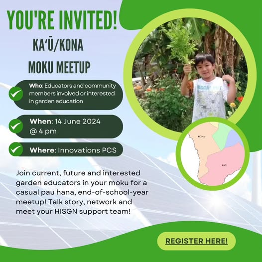 We support more than 60 school learning gardens on Hawai‘i Island through professional development, advocacy, mentorship, and technical assistance.
