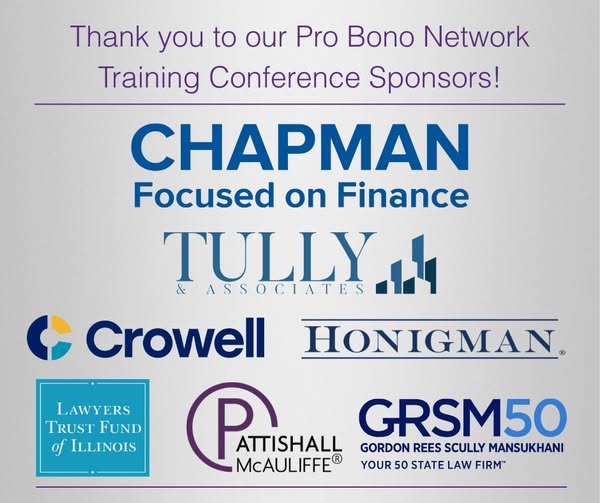 Pro Bono Network is so grateful for our generous conference sponsors: Lead Sponsor: Chapman and Cutler LLP Champion Sponsor: Tully & Associates Justice Sponsor: Lawyers Trust Fund Service Sponsors: Crowell & Moring(@crowell. moring), Gordon Rees Scully Mansukhani (@gordonreesscullymansukhani), Honigman, and Pattishall McAuliffe Thanks to these incredible sponsors, we can offer a new training conference on October 15th. By hosting this event downtown, we're bringing together volunteer attorneys from across Chicagoland for CLE-accredited training, networking, and inspiration to participate in pro bono work.