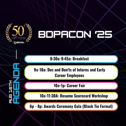 ✨ Day 3 at #BDPACON2025 — Where Opportunity Meets Elegance. ✨ We’re closing out this incredible conference with purpose, power, and a touch of glamour. Here’s what Day 3 brings: 🎯 Career Fair Connect with top-tier companies and hiring managers looking for diverse talent in tech.