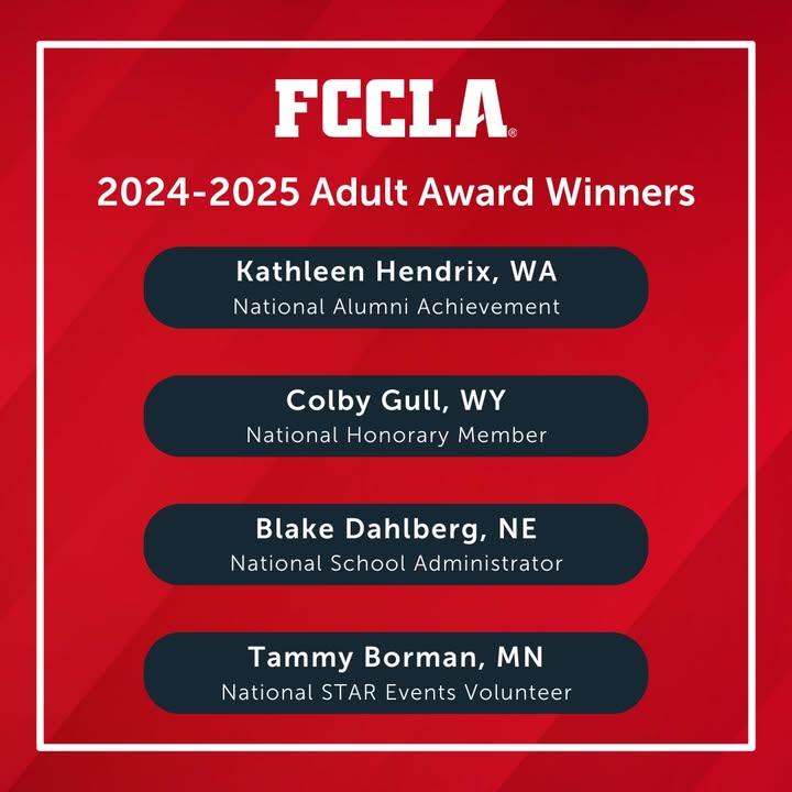 Celebrating Excellence: FCCLA’s 2025 National Adult Awards FCCLA is proud to recognize the outstanding individuals who have gone above and beyond in their support of Family, Career and Community Leaders of America. This year’s National Adult Awards honor exceptional contributions across service, leadership, and advocacy. We celebrate the recipients of the:� ✨ National Alumni Achievement Award ✨ National Honorary Member Award ✨ National School Administrator Award ✨ National STAR Events Volunteer Award These distinguished honorees exemplify a deep commitment to FCCLA’s mission and values.