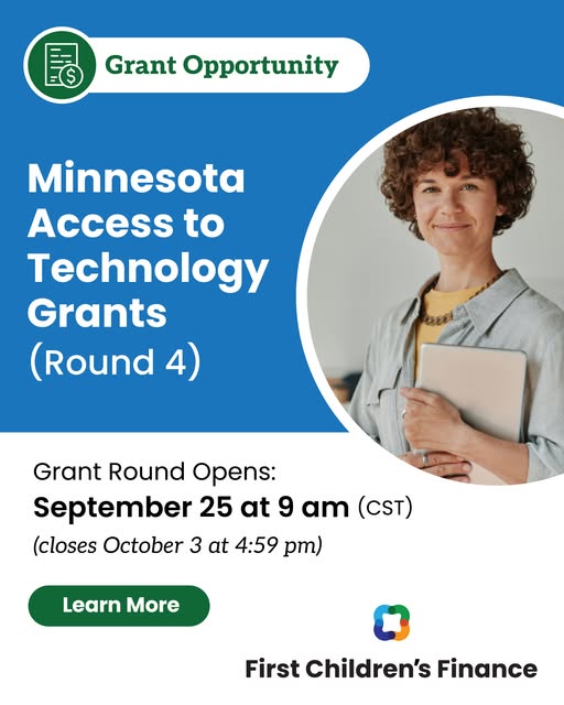 Minnesota child care providers, great news. First Children’s Finance is excited to announce Round 4 of the Minnesota Access to Technology Grants. These grants are designed to help child care businesses invest in the tools and technology they need to thrive whether that’s improving business operations, connecting with families, or using technology to support high-quality care.