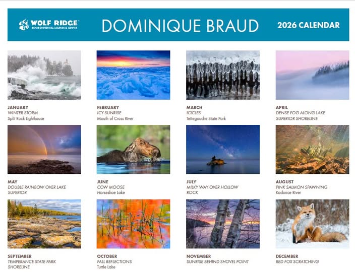 📅 The Wolf Ridge 2026 Calendars Are Here. Bring the North Shore into your home all year long. Our 2026 calendars are now available, featuring breathtaking images from the seven state parks that line Lake Superior’s North Shore — captured by Minnesota photographer Dominique Braud.
