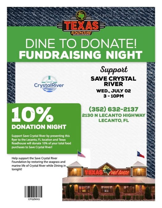 TODAY'S THE DAY. 😄 🌊 Please join us at our 2nd "Restaurant River Nights" Fundraiser at Texas Roadhouse in Lecanto 🥩 📍 Where: Texas Roadhouse, 2130 N. Lecanto Highway, Lecanto, FL 📅 When: July 2 | 3:00 PM – 10:00 PM 🎯 Why: To support Save Crystal River – 10% of your total meal purchase will be donated.