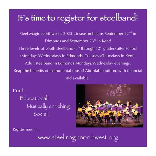 Welcome to Steel Magic Northwest. We teach music and build community in the context of the modern steel orchestra in the Seattle, WA area. Steel Magic Northwest exists to teach music, teamwork, discipline, and leadership, and to build community in the context of the modern steel orchestra.Our specific goals are to:• Provide a safe, family-structured after school environment where children from 5th through 12th grade can not only learn music, but also discipline, teamwork, the value and rewards of dedication and patience, and leadership skills as they move up in the graduated ensembles.• Provide an ongoing support community for the participants. • Remove any financial or logistical barriers to participation for children from low-income families. • Provide a rich environment for adult learning, where lifelong learners of all ages and from diverse backgrounds can bond through the unifying power of music.• Educate and entertain the general public with the music we make, in our indoor concert series, and in free outdoor public performances in the area.• Lead by example to generate regional enthusiasm for these programs, training music educators at the many schools in our region which aren’t currently using their steel band instruments due to lack of specialized training.