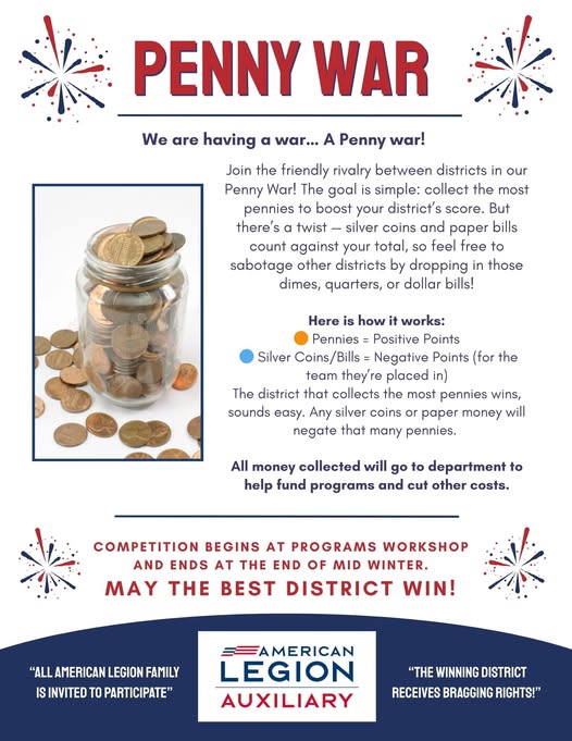 With the 7th District Conference happening this weekend in Sidney, it’s time to round up your spare change. Dig through your pockets, check the washing machine, and raid those change jars. What a fun and exciting way to support the Iowa American Legion Auxiliary.