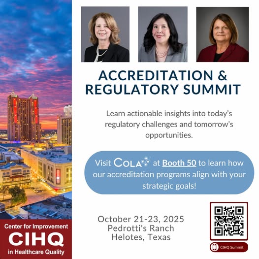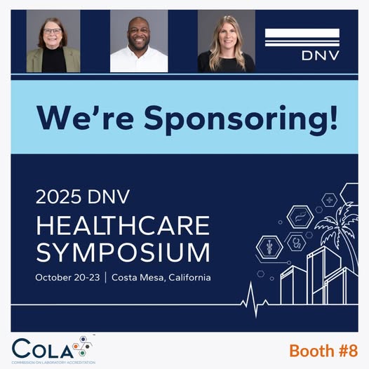 Are you attending the DNV Healthcare Symposium October 20–23. Stop by Booth #8 to connect with COLA’s team: Kathy Nucifora, MPH, MLS(ASCP), Chief Operating Officer; Donte Dudley, Business Development Representative; and Kim Ogren, BS, MLS(ASCP)CM, Director of Clinical Accreditation. We look forward to seeing you there.