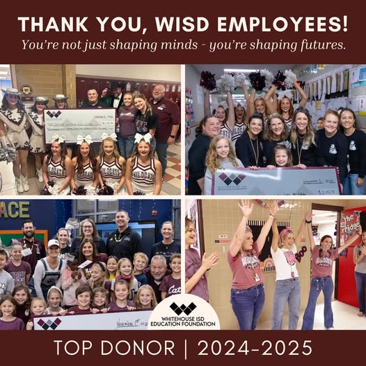 Whitehouse ISD employees: YOU are our top donor this year. ❤️ Through payroll deductions and direct giving, your generosity fuels innovation, enriches classrooms, and opens new doors for students across our district. Thank you for believing in the power of education—and for going beyond the classroom to support it.