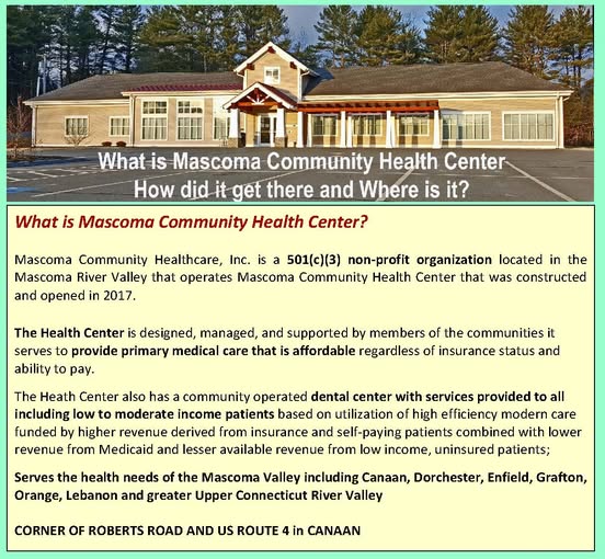 Home Mascoma Community Health Center Right Care Right Costs Right Here. Mascoma Community Healthcare IncPO Box 55018 Roberts RdCanaan NH 03741 Contact Dental Practice6037804242 Contact Medical Practice6035234343 Hours MedicalMon Fri8 am5 pm Dental Now Open. Like us on FaceBook Subscribe to our Email List Support Mascoma Health Center. We choose to have a quality community clinic that serves the five Mascoma Towns.