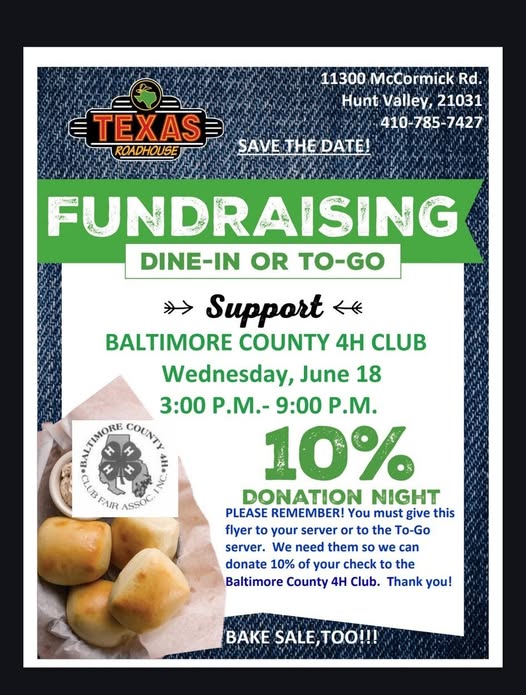 It's that time of year. The annual fair fundraiser at Texas Roadhouse will align with the Fair Board meeting on Wednesday June 18th. Stop by the meeting and stop by Texas Road house for dinner on your way home Bake sale items are requested from clubs to help draw in my funds from the waiting crowd.
