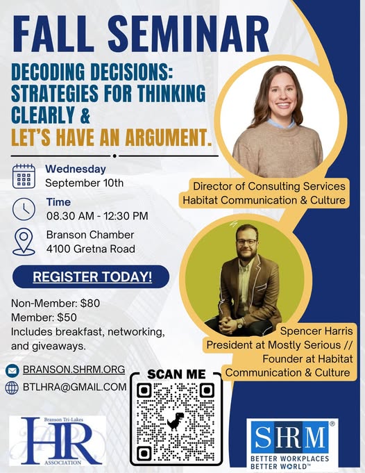 π§ Ready to sharpen your decision-making and debate skills. Join us for the Fall Seminar: "Decoding Decisions: Strategies for Thinking Clearly & Let's Have an Argument" π Wednesday, September 10 β° 8:30 AM β 12:30 PM π Branson Chamber | 4100 Gretna Road Hear from top voices in communication and strategy, including Spencer Harris, President at Mostly Serious and Founder of Habitat Communication & Culture. ποΈ Members: $50 | Non-Members: $80 Includes breakfast, networking, and giveaways.