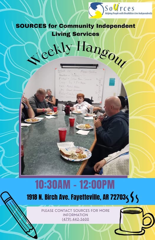 Disability Services | Sources for Community Independent Living Home WIPA Classes Groups News Events The Future Contact More Welcome toSOURCES Your onestop disability resource center for Northwest Arkansas SOURCES provides services support and advocacy for individuals with disabilities their families and the Northwest Arkansas community. SOURCES offers Core services to the community including advocacy information referral resources independent living skills training peer support and transition services. SOURCES calendar of events lists our upcoming Peer Support Group meetings training classes and special events for people of all abilities. Home WIPA Classes Groups News Events The Future Contact More CONTACT Toll Free 888 2847521 Video 479 4398314 Local 479 4425600 Video 479 4398330 Fax 479 4425192 2025 by Sources for Community Independent Living Inc.