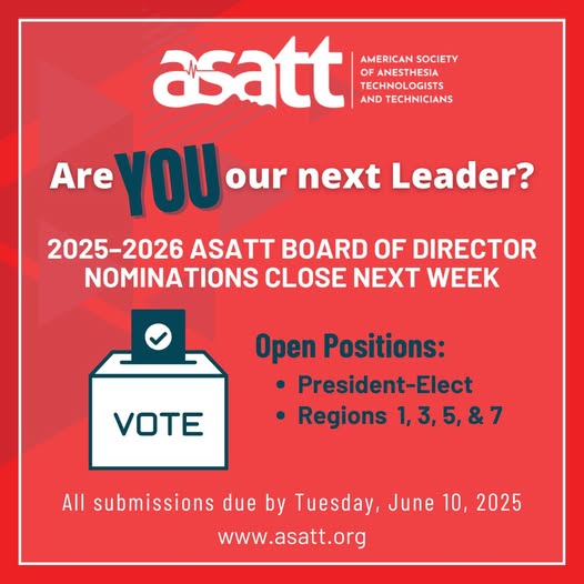 The countdown is on. Less than one week left to submit nominations for the ASATT Board of Directors. Open roles: - President-Elect - Regional Directors for Regions 1, 3, 5, & 7 Help shape the future of our profession by joining a leadership team that drives growth and collaboration.